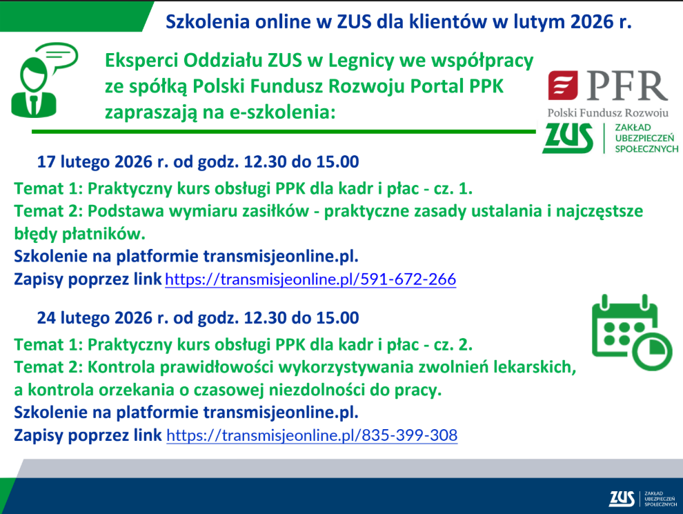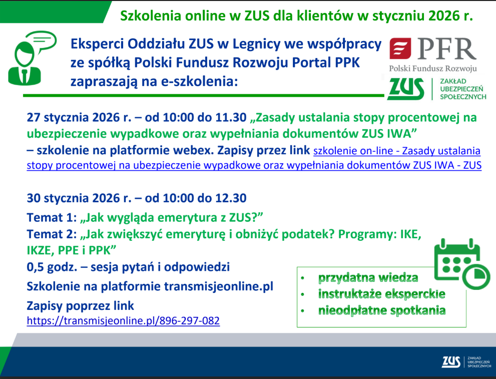 W styczniu i w lutym 2026 r. legnicki ZUS zaprasza na bezpłatne szkolenia online dotyczące ubezpieczenia wypadkowego, praktycznych zasad ustalania wysokości zasiłków i najczęstszych błędów popełnianych przez płatników.