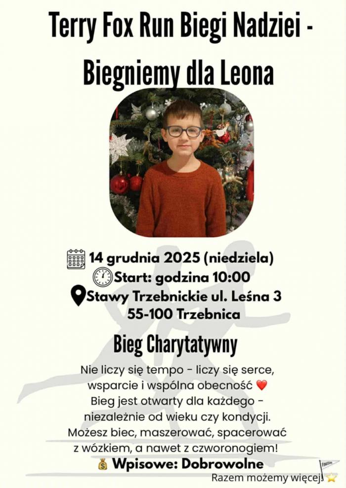 14 grudnia 2025 roku w Trzebnicy odbędzie się charytatywny bieg Terry Fox Run Biegi Nadziei. Uczestnicy pobiegną, pomaszerują lub przejdą trasę, by wesprzeć Leona, wyjątkowego chłopca, który każdego dnia walczy z ciężkimi chorobami: stwardnieniem guzowatym, guzami w mózgu, sercu i nerce, a także z padaczką i autyzmem.