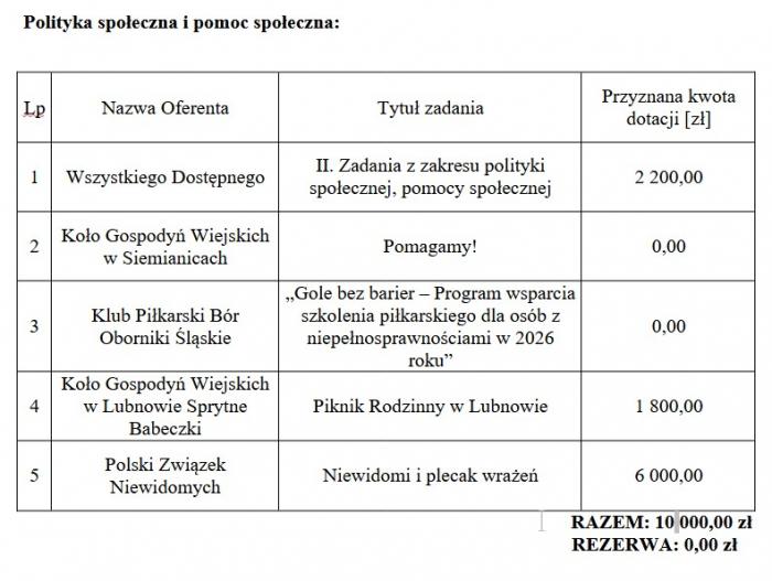 Na politykę społeczną i pomoc społeczną przeznaczono 10 tys. zł. W tej kategorii 6 tys. zł otrzymał Polski Związek Niewidomych na zadanie „Niewidomi i plecak wrażeń”.