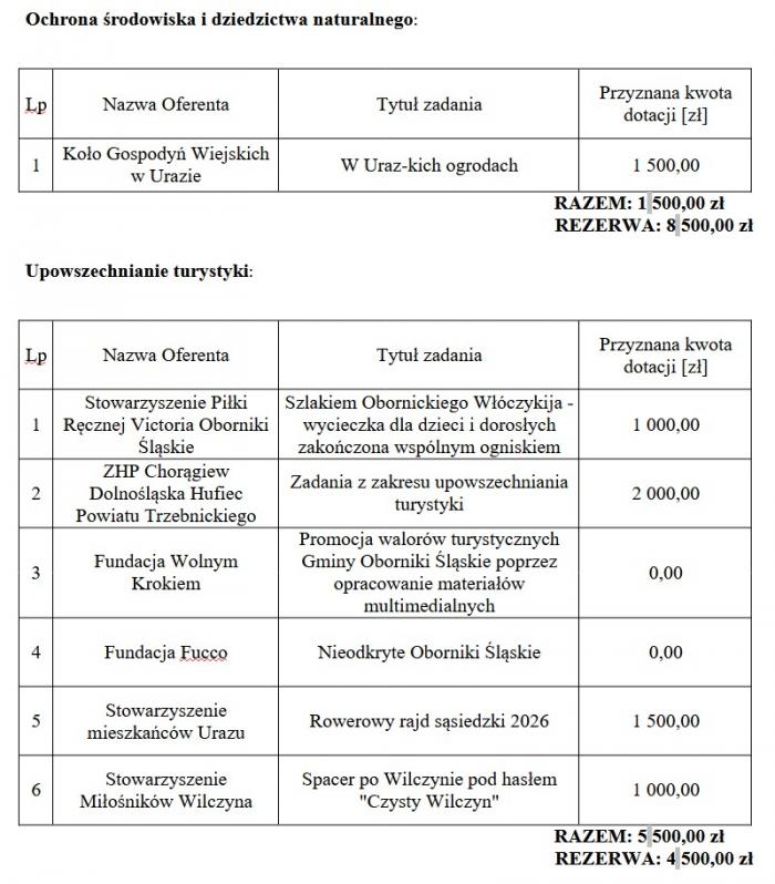 Pozostałe środki rozdysponowano na ochronę środowiska i dziedzictwa naturalnego – 1 500 zł – oraz na upowszechnianie turystyki – 5 500 zł.