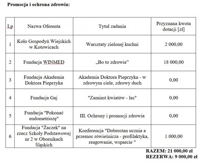 W obszarze promocji i ochrony zdrowia, gdzie łączna pula wynosi 21 tys. zł, największą dotację – 18 tys. zł – przyznano Fundacji WINMED na realizację projektu „Bo to zdrowie”.