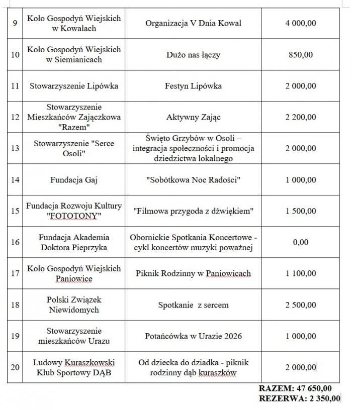 Komisja konkursowa analizowała wnioski z różnych obszarów życia społecznego – od pomocy społecznej, przez działania dla seniorów i promocję zdrowia, po kulturę, edukację, ochronę środowiska i turystykę. O przyznaniu dotacji decydowały m.in. jakość zaplanowanych działań, ich zasięg, realność kosztorysu oraz zakładane efekty.