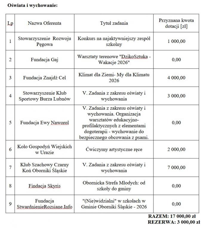 W zakresie oświaty i wychowania, na który zaplanowano 17 tys. zł, 7 tys. zł trafi do Klubu Szachowego Czarny Koń Oborniki Śląskie.