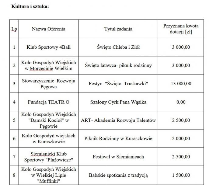 Najwyższą pulę środków w budżecie przeznaczono na kulturę i sztukę – 47 650 zł. W tym obszarze 13 tys. zł otrzymało Stowarzyszenie Rozwoju Pęgowa na organizację festynu „Święto Truskawki”. To jedno z najbardziej rozpoznawalnych wydarzeń plenerowych w gminie.