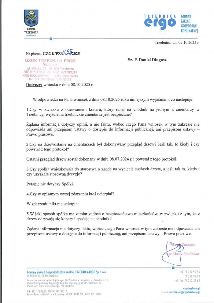 W czwartek, otrzymaliśmy odpowiedź od Marii Spalińskiej, prezes gminnej spółki komunalnej Trzebnica - Ergo, która zarządza cmentarzami. Odpowiedź jest conajmniej kuriozalna, a Pani prezes jakby zapomniała, że reprezentuje spółkę publiczną, a nie prywatną. Sami zobaczcie. Poniżej zamieszczamy pismo prezes Sapalińskiej. Są w nim też nasze pytania.