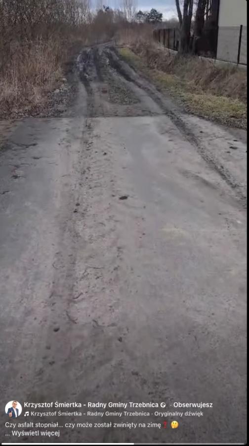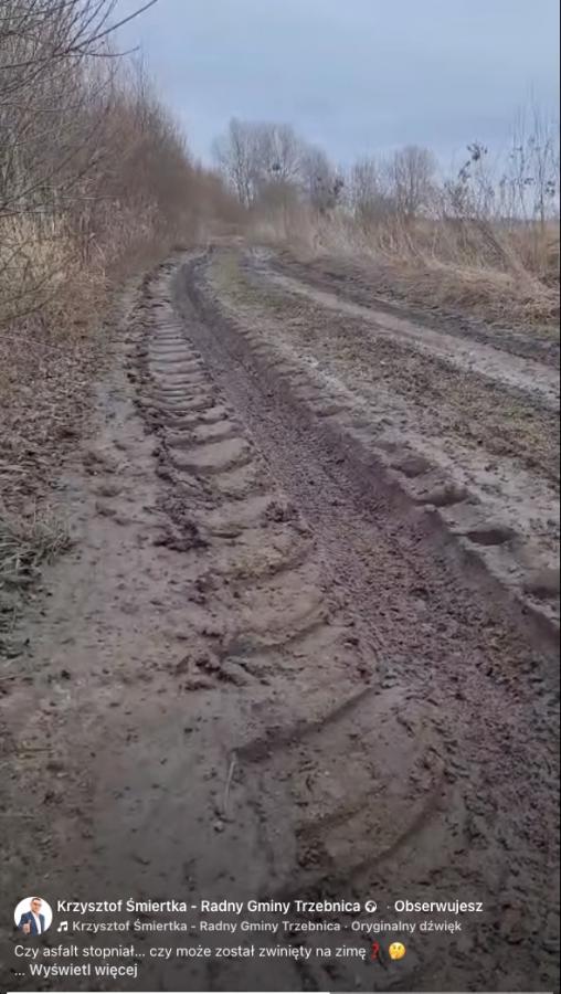 Krzysztof Śmiertka pojechał na miejsce. Ujawnił, że to co wypisują urzędnucy, to zwykłe kłamstwo. Na filmie pokazał, że zbudowano raptem kilkaset metrów asfaltu, który kończy się zaraz za Małuszynem i... łączy z rozkopaną i zniszczoną po zimie polną drogą. Radny zamieścił nagranie video i pokazał, gdzie wspomniana droga się urywa. Na nagraniu widać ogromne koleiny, tak więc samochodem do drogi powiatowej Nowy Dwór - Brzyków, przejechać się nie da.