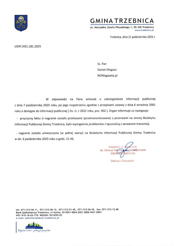 Pamiętacie nasz artykuł o podwyżce pensji dla burmistrza Marka Długozimy? To wtedy, czyli 6 października, napisaliśmy na Portalu NOWAGAZETA.pl, że na stronie BIP Urzędu Miejskiego w Trzebnicy pojawiło się pocięte (czyli niepełne) nagranie z sesji. Nie było fragmentów dyskusji ani w sprawie podwyżki pensji, ani w sprawie muzeum widmo czy w sprawie Polonii Trzebnica.