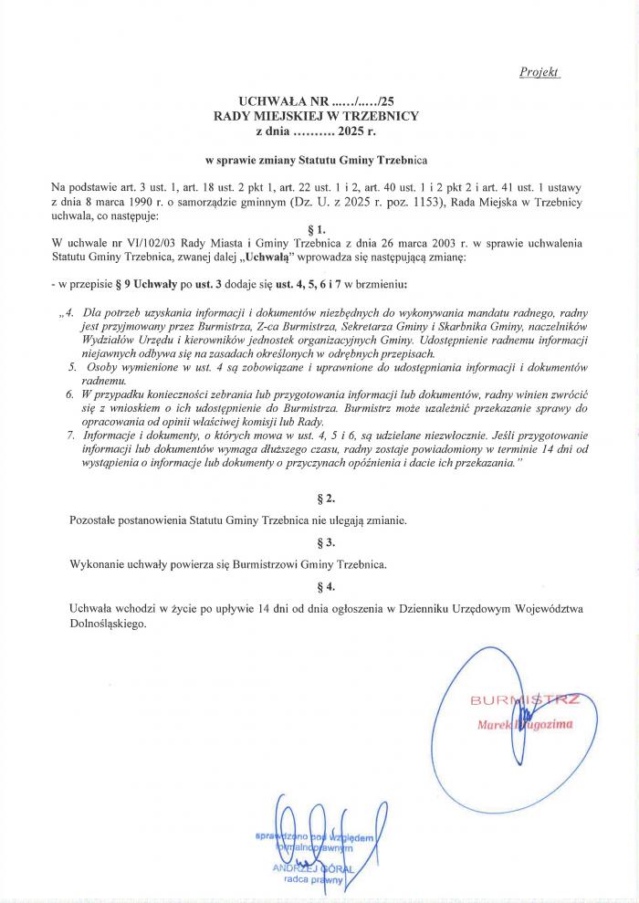 - Uchwała nr XVIII/177/2025 Rady Miejskiej w Trzebnicy z dnia 27 listopada 2025 r. w sprawie zmiany Statutu Gminy Trzebnica wpłynęła do Wojewody Dolnośląskiego w dniu 1 grudnia 2025r. Zatem z tym dniem zaczyna biec termin, w którym organ nadzorczy - zgodnie z przepisami art. 91 i art. 93 ustawy z dnia 8 marca 1990 r. o samorządzie gminnym - w przypadku stwierdzenia istotnego naruszenia prawa, może orzec o nieważności uchwały w terminie nie dłuższym niż 30 dni od dnia doręczenia uchwały albo - po upływie tego terminu - może zaskarżyć uchwałę do sądu administracyjnego. W związku z powyższym informacja o wynikach postępowania nadzorczego, które prowadzone jest z urzędu, zostanie przekazane po jego zakończeniu. Ponadto, jak wyżej wskazano, organ nadzoru prowadzi postępowanie nadzorcze z urzędu i żadne wnioski osób trzecich nie stanowią podstaw do jego wszczęcia. Do organu nadzoru wpłynęło jedno pismo zatytułowane jako „Wniosek o stwierdzenie nieważności uchwały” dotyczące przedmiotowej uchwały - odpisał nam Tomasz Jankowski, rzecznik prasowy Wojewody Dolnośląskiego.