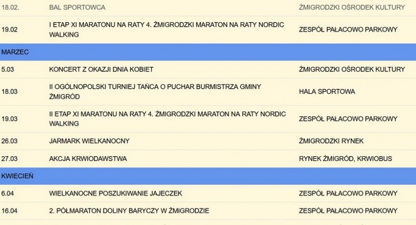 Wszystkie wydarzenia w Gminie Żmigród spisane w jednym miejscu. Już teraz możesz zobaczyć, co Cię interesuje i jakie wydarzenie warto wpisać do swojego kalendarza. Najbliższe to Bal Sportowca w sobotę 18 lutego i następnego dnia I etap XI Maratonu na Raty. Cała lista, z imprezami do końca roku, znajduje się pod tym linkiem: www.zpk-zmigrod.eu/kalendarz-imprez