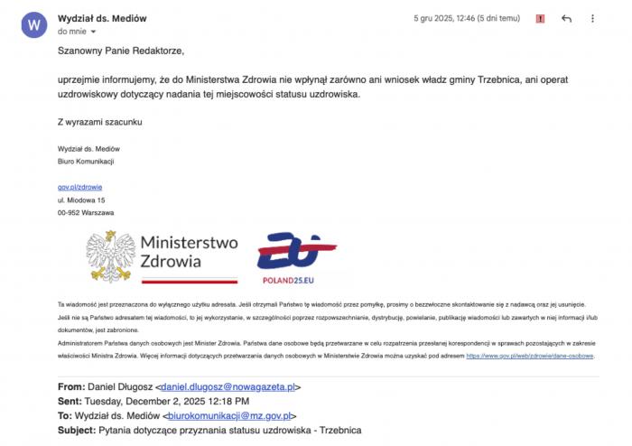 - Szanowny Panie Redaktorze, uprzejmie informujemy, że do Ministerstwa Zdrowia nie wpłynął zarówno ani wniosek władz gminy Trzebnica, ani operat uzdrowiskowy dotyczący nadania tej miejscowości statusu uzdrowiska. Z wyrazami szacunku - wydział ds. Mediów Biuro Komunikacji Ministerstwa Zdrowia.