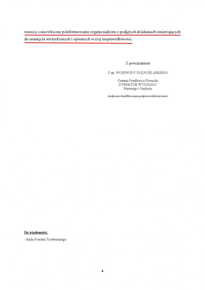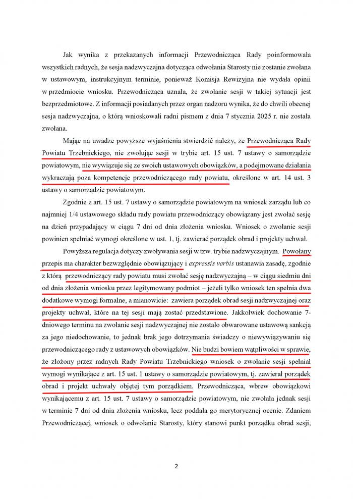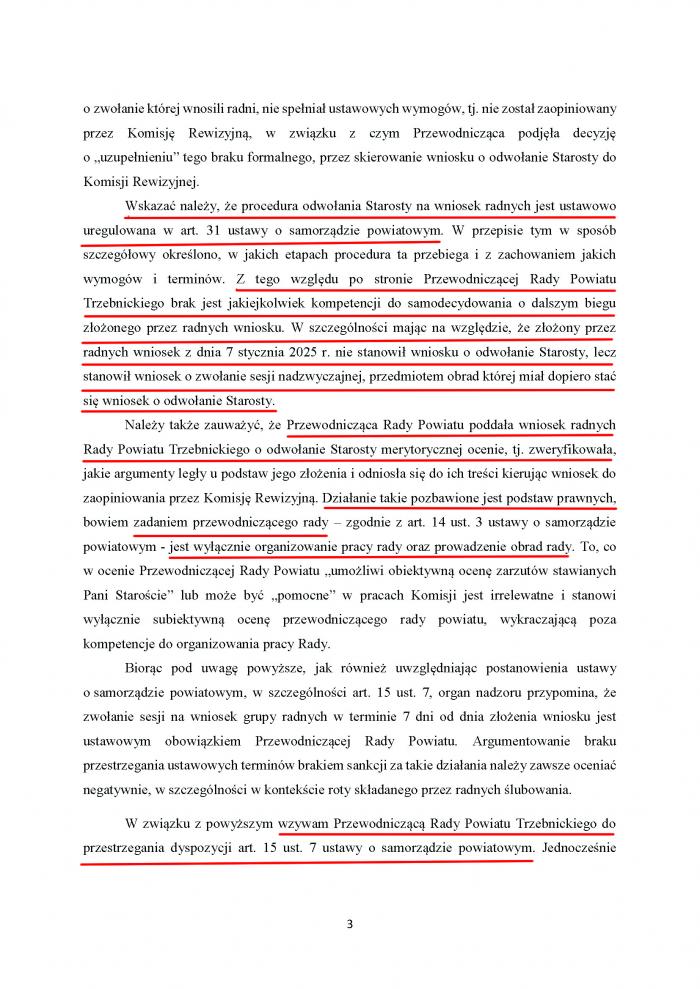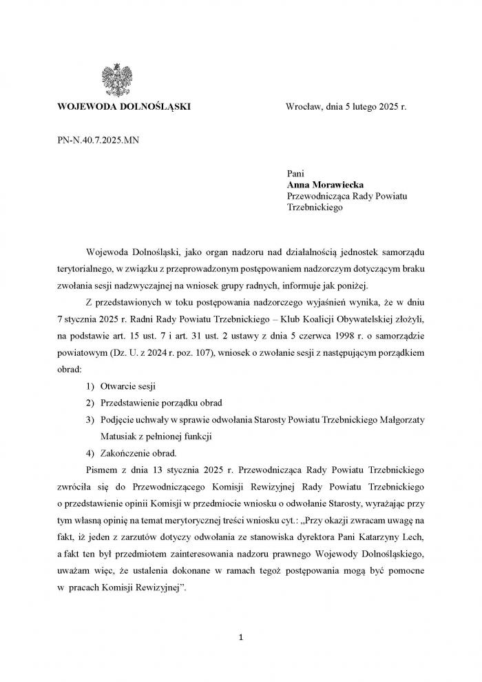 - Wojewoda dolnośląski zakończył postępowanie sprawdzające w temacie nie zwołania sesji nadzwyczajnej Rady Powiatu Trzebnickiego. Postępowanie potwierdziło, że przewodnicząca Rady Powiatu Trzebnickiego nie wykonała swoich obowiązków wynikających z ustawy, ponieważ nie zwołała sesji nadzwyczajnej w wymaganym terminie - odpowiedział Tomasz Jankowski, rzecznik prasowy Wojewody Dolnośląskiego: - Zgodnie z przepisami, jeśli zarząd powiatu lub co najmniej 1/4 radnych złoży wniosek o zwołanie takiej sesji, przewodniczący rady musi ją zorganizować w ciągu 7 dni. Warunkiem jest, aby wniosek zawierał porządek obrad i projekty uchwał. Co w tym przypadku miało miejsce. Radni złożyli poprawnie przygotowany wniosek, ale przewodnicząca nie zwołała sesji na czas. Zamiast tego oceniła treść wniosku, choć nie miała do tego prawa – jej zadaniem było jedynie zorganizowanie posiedzenia. Co ważne, wniosek radnych nie dotyczył bezpośrednio odwołania starosty, lecz jedynie zwołania sesji, na której ten temat miał być omówiony. Przewodnicząca przekroczyła więc swoje uprawnienia, ingerując w proces, który jest ściśle określony przepisami. Wojewoda dolnośląski w ramach swoich kompetencji, mógł to postępowanie zakończyć jedynie wezwaniem Przewodniczącej Rady Powiatu Trzebnickiego do przestrzegania przepisów prawa. Równocześnie wojewoda dolnośląski zobowiązał Przewodniczącą Rady, do poinformowania o nowym terminie zwołania sesji.