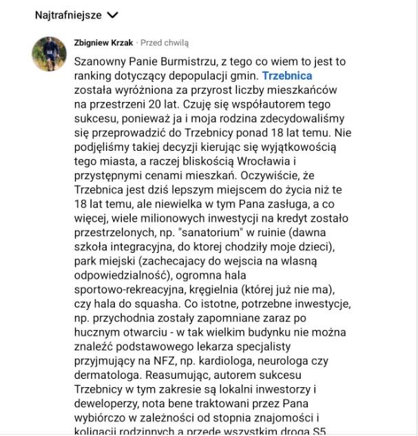 Mieszkaniec rzeczowo wskazuje, że opisywany ranking dotyczy depopulacji na przestrzeni 20 lat. Dodaje, że on i jego rodzina wprowadzili się do Trzebnicy 18 lat temu, ale nie podjęli tej decyzji kierując się wyjątkowością miasta, a bliskością Wrocławia i przystępnymi cenami mieszkań. Mieszkaniec wskazuje, że wprawdzie Trzebnica jest dziś zdecydowanie lepszym miejscem do mieszkania, ale poddaje w wątpliwość, czy to zasługa burmistrza. Wskazuje, że to wielomilionowe dotacje unijne oraz życie na kredyt spowodowały te zmiany. Dalej przypomina też o przestrzelonych inwestycjach burmistrza czyli np. o zakupie za miliony „sanatorium” w ruinie, gdzie kiedyś mieściła się szkoła integracyjna, do której uczęszczały jego dzieci. Podaje też przykład kręgielni, której już nie ma, bo po zalaniu pomieszczeń została zlikwidowana.