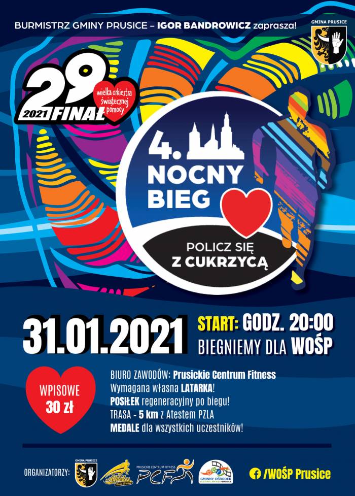 Ruszyły zapisy na 4. Nocny Bieg - Policz się z cukrzycą Prusice 2021, który ma odbyć sie w ramach 29 finału Wielkiej Orkiestry Świątecznej Pomocy 31 stycznia 2021. Start o godzinie 20:00.