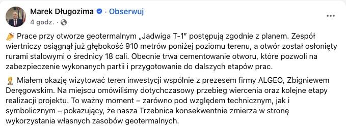 Ale coś chyba idzie nie tak, bo dzisiaj, czyli 15 października Marek Długozima zamieścił kolejny post: - Prace przy otworze geotermalnym „Jadwiga T-1” postępują zgodnie z planem. Zespół wiertniczy osiągnął już głębokość 910 metrów poniżej poziomu terenu, a otwór został osłonięty rurami stalowymi o średnicy 18 cali. Obecnie trwa cementowanie otworu, które pozwoli na zabezpieczenie wykonanych partii i przygotowanie do dalszych etapów prac - informuje włodarz.
