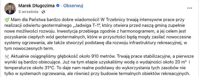 3 września tego roku, Marek Długozima zamieścił entuzjastyczny post swoim Facebooku: - Mam dla Państwa bardzo dobre wiadomości! (...) Aktualnie osiągnęliśmy głębokość około 910 metrów. Trwają prace stabilizacyjne, a pierwsze wyniki są bardzo obiecujące. Już na tym etapie uzyskaliśmy wodę o wydajności około 20 m³ i temperaturze około 31°C. To daje nam realne podstawy do wykorzystania tych zasobów nie tylko w systemach ogrzewania, ale również przy budowie termalnych obiektów rekreacyjnych - pisał burmistrz i zamieścił mnóstwo zdjęć ze swojej roboczej wizyty.