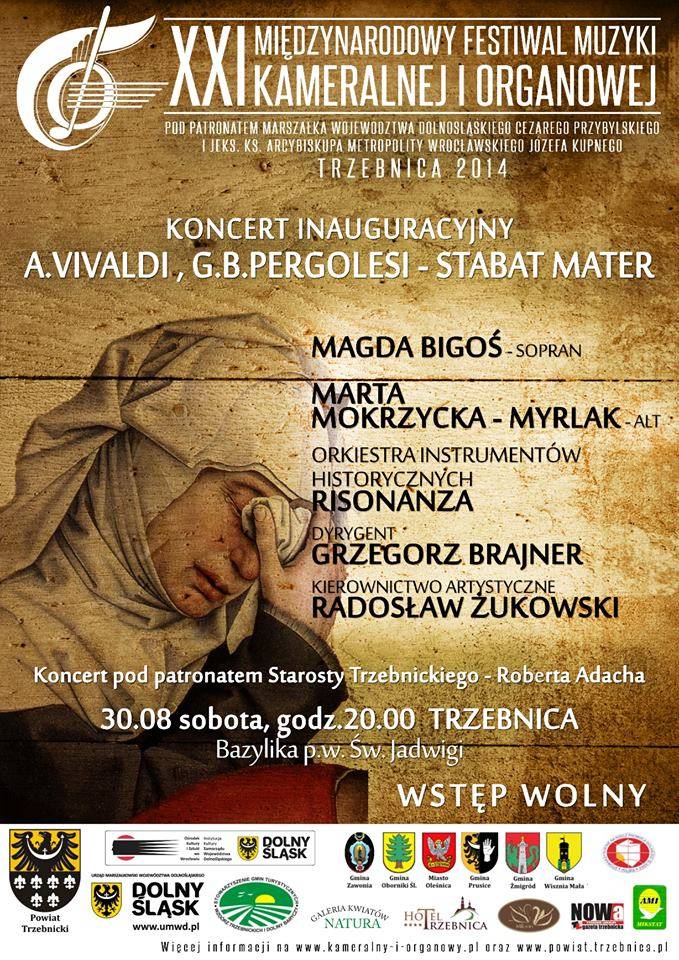 30 sierpnia, sobota, godz. 20, Trzebnica, bazylika św. Jadwigi - Inauguracja Festiwalu, koncert pod patronatem starosty trzebnickiego Roberta Adacha - A. Vivaldi, G.B. Pergolesi - Stabat Mater. Soliści: Magda Bigoś - sopran, Marta Mokrzycka - Myrlak - alt, Orkiestra Instrumentów Historycznych Risonanza, dyrygent - Grzegorz Brajner, kierownictwo artystyczne - Radosław Żukowski;Jeśli jeszcze tego nie zrobiłeś koniecznie zainstaluj naszą aplikację, która dostępna jest na telefony z systemem Android i iOS.
