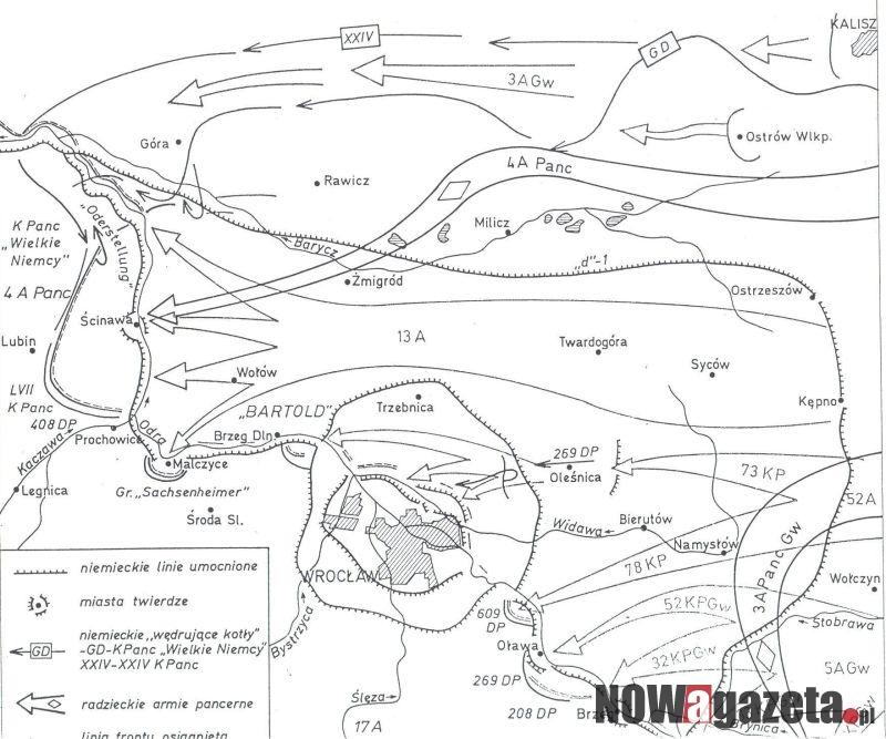 24 stycznia już o 7 rano opuściliśmy swoje pozycje Pomaszerowaliśmy w stronę Piotrkowic. Po postoju, przez Kopaszyn wróciliśmy do Trzebnicy. Tutaj dostaliśmy rozkaz wymarszu do Wrocławia. Dostaliśmy książeczki wojskowe, broń i amunicję. W Trzebnicy na podwórzu szkoły ewangelickiej zebrał się cały Volkssturm w sile trzech kompanii. Przydzielono jednostkę Wehrmachtu (ozdrowieńców z trzebnickiego lazaretu) i jednostkę pancerną wspomnianą poprzednio. Pozycja obronna naszego odcinka przebiegała od pagórka koło gimnazjum, gdzie ustawiono karabin maszynowy, po Nowy Dwór oraz Księginice.... Nocą udałem się na skontrolowanie odcinka koło Księginic i zauważyłem pożary w północnej i wschodniej strony... Czwartek 25 był czarnym dniem dla niektórych kolegów. O godzinie 7 rozległ się grzmot i drżenie w powietrzu. Jeden z naszych kolegów strzałem z panzerfausta uszkodził radziecki pojazd, który wycofał się do Księginic. Wkrótce rozpoczął się ostrzał z radzieckich granatników. O godzinie 9 otrzymaliśmy silny ostrzał z Kociej Góry i trzeba przyznać, że wróg dobrze osiągnął swój cel. W tym czasie kolumna samochodów ciężarowych jadąca z Głuchowa Górnego ostrzelana została przez nasz czołg i zmuszona do odwrotu. Czoło kolumny płonęło.