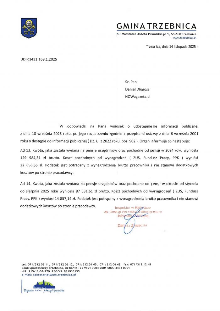 Tylko w 2024 roku na ich pensje oraz pochodne wydano 129.934,31 zł brutto. Koszt pochodnych od pensji wyniósł 22.656,65 zł. Jak łatwo policzyć razem referat do spraw udzielania informacji publicznej kosztował podatników ponad 152 tysiące złotych!