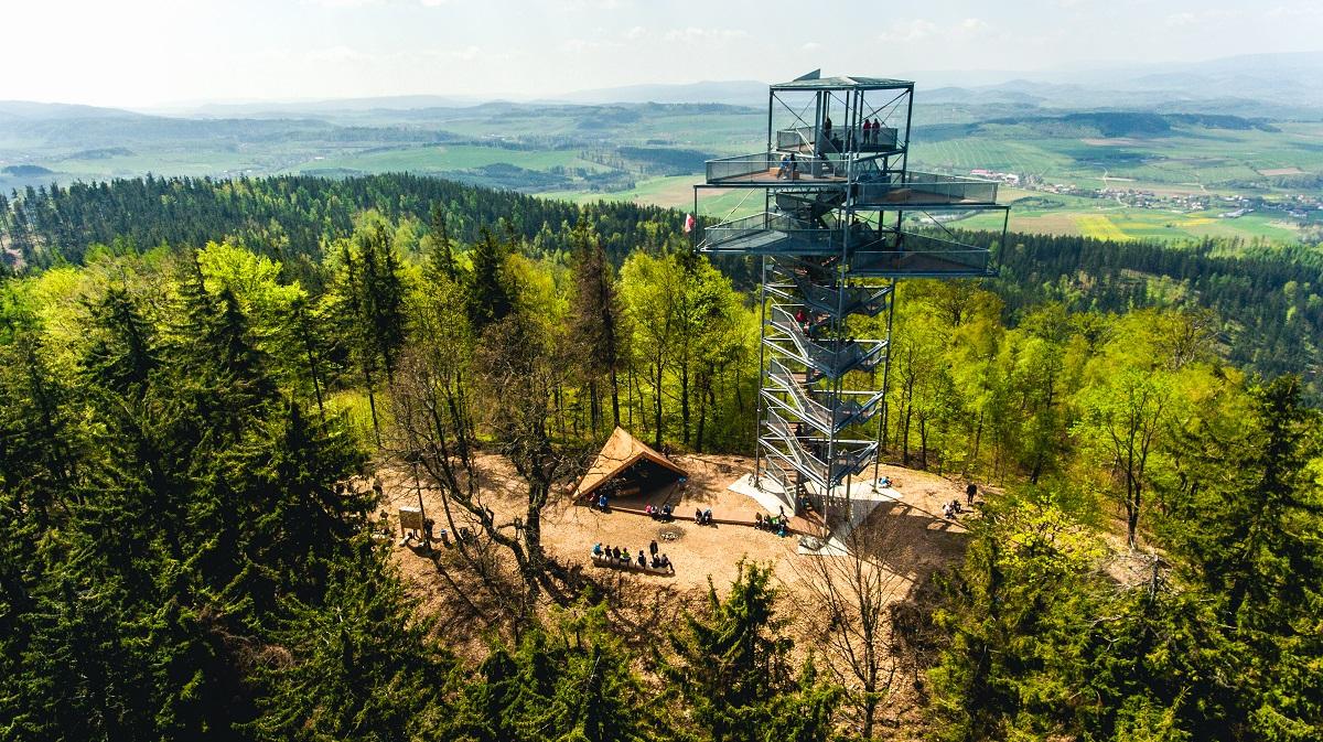 Licząca prawie 30 metrów wysokości wieża składa się z platform widokowych na pięciu kondygnacjach. Rozpościerający się z niej widok jest naprawdę imponujący – kusi zarówno turystów, jak i fotografów. To jedna z atrakcji Ekomuzeum wokół masywu Trójgarbu i sąsiedniego Chełmca, które powstało dzięki unijnej dotacji.