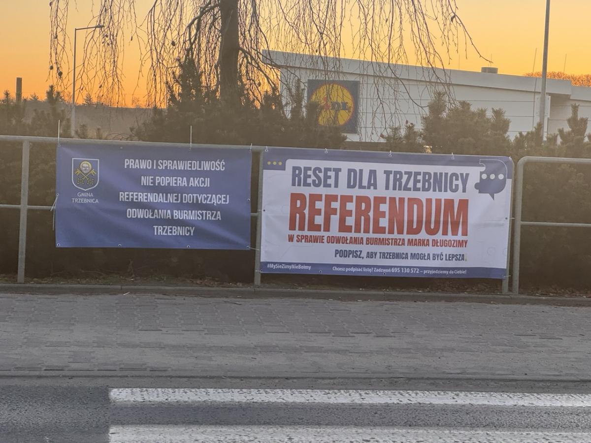 W Trzebnicy trwa banerowa wojna o referendum. Po weekendowej akcji inicjatorów głosowania nad odwołaniem burmistrza, w środę w mieście pojawiły się niebieskie plakaty z jasnym przekazem: PiS nie popiera referendum. Na banerach nie ma jednak logo partii – jest za to znak gminy.