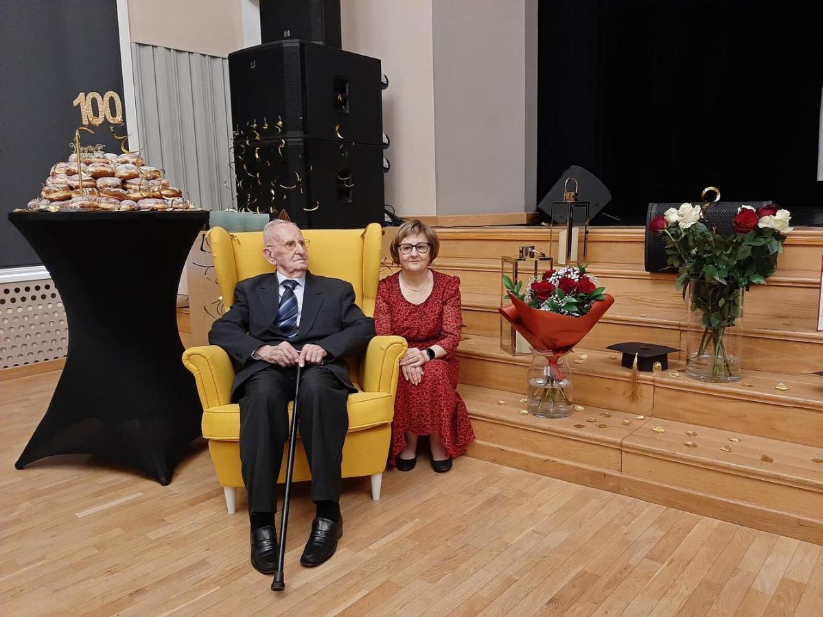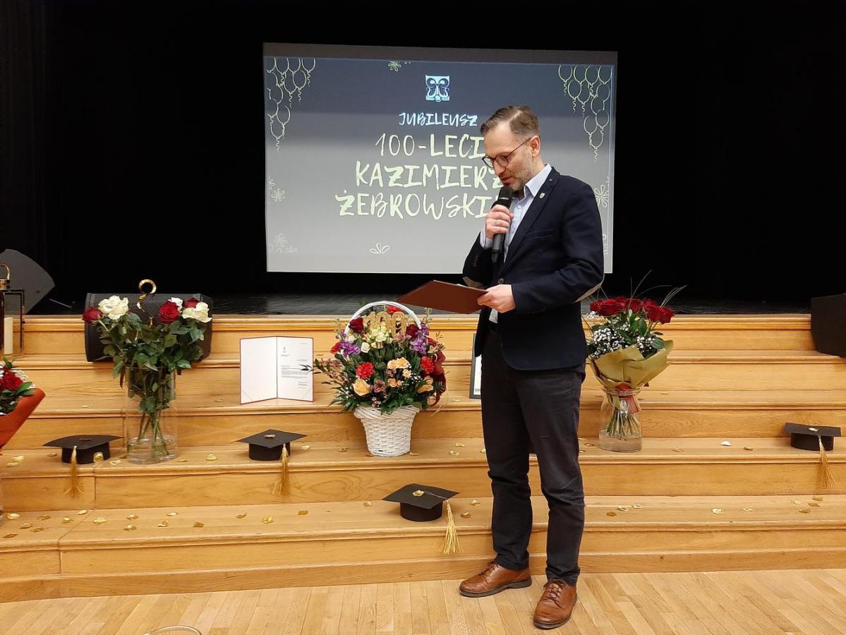 Galeria z jubileuszu 100. urodzin prof. Kazimierza Żebrowskiego w OOK. Widać część oficjalną z wykładem dr. Jerzego Żebrowskiego, życzeniami i listami gratulacyjnymi od samorządu oraz SUTW „Atena”. Są też występy kabaretu „To i Owo” i zespołu „Seniorita”, a także wyjątkowy moment, gdy Jubilat dał się zaprosić do tańca.