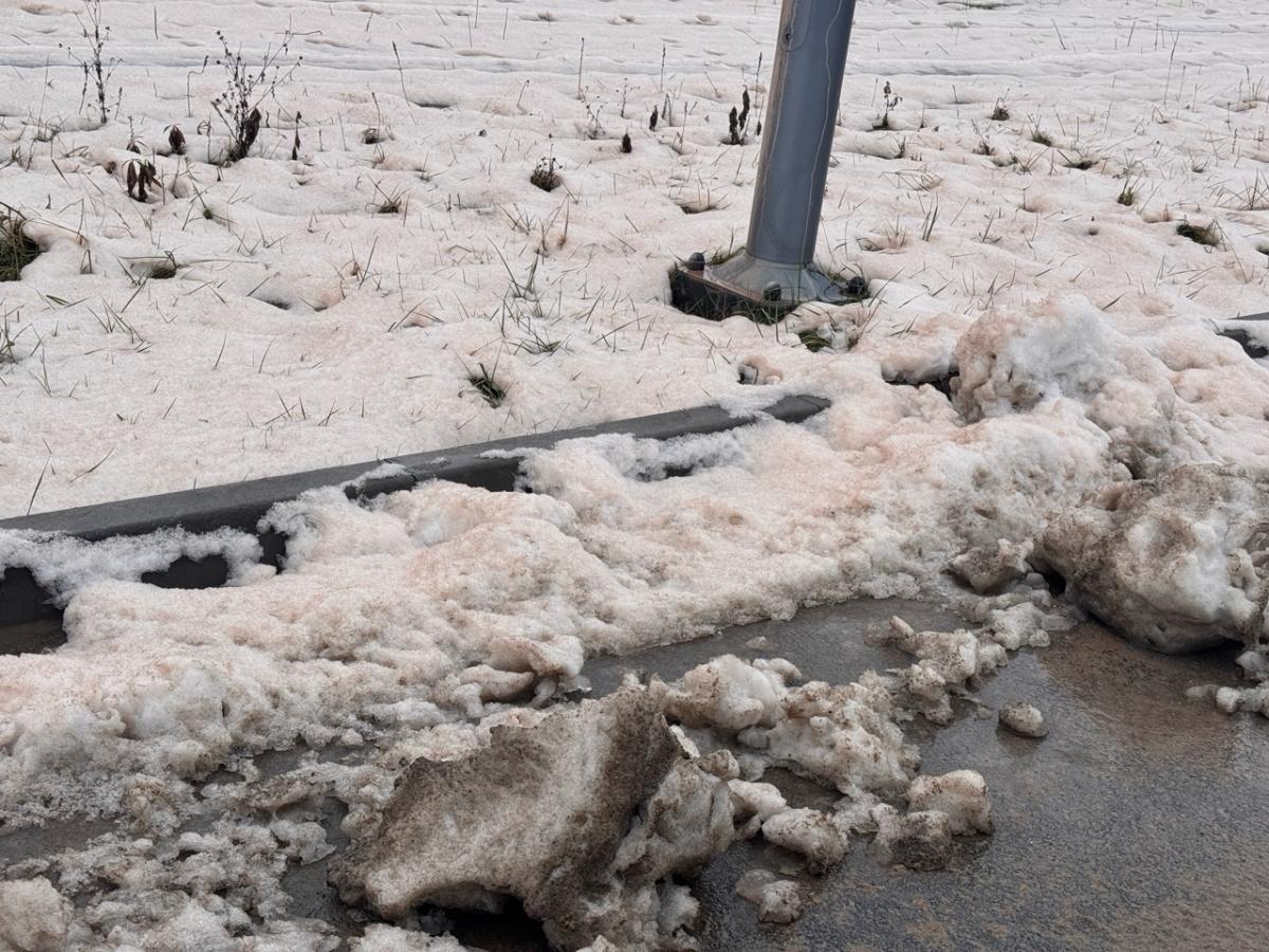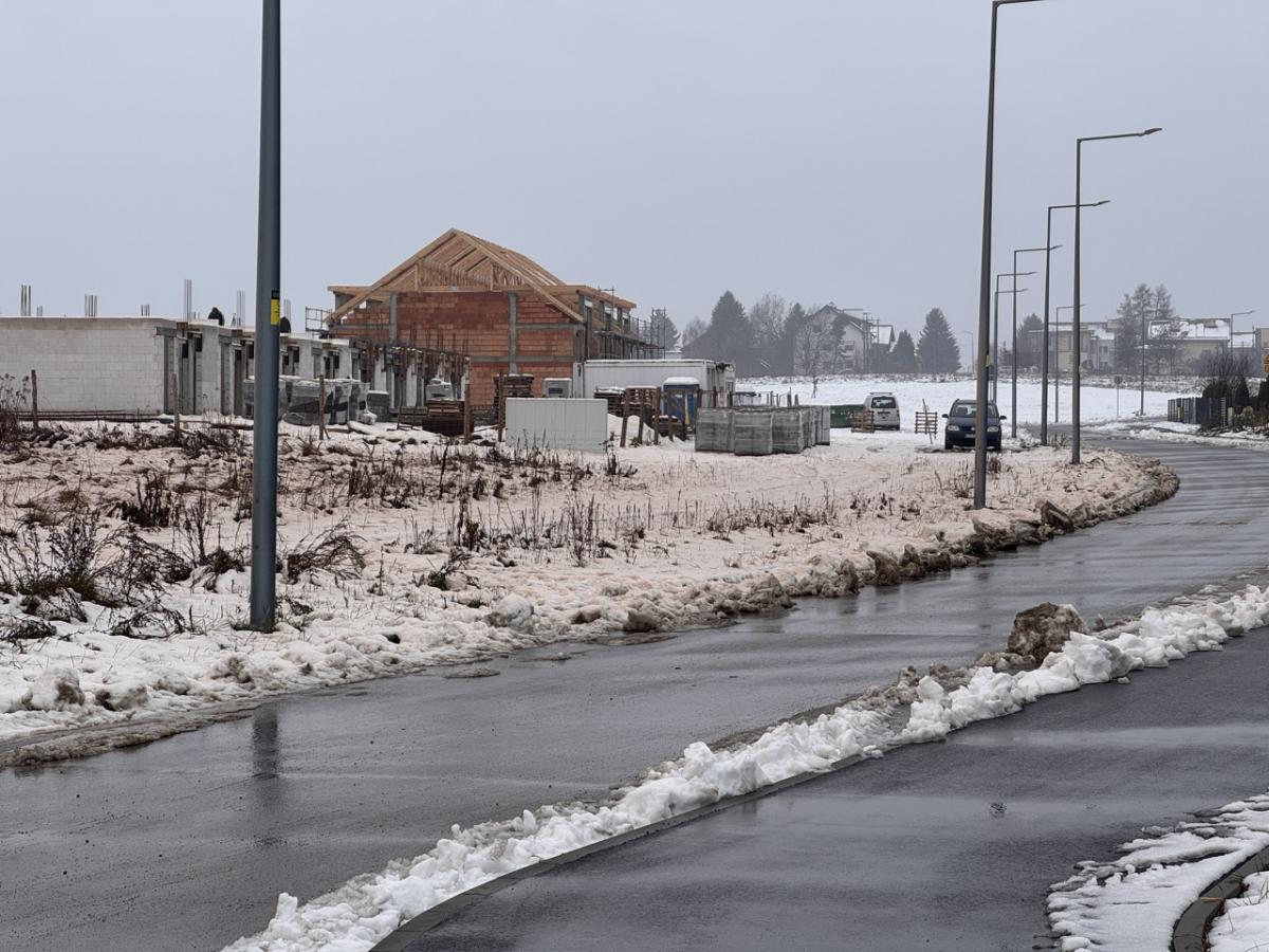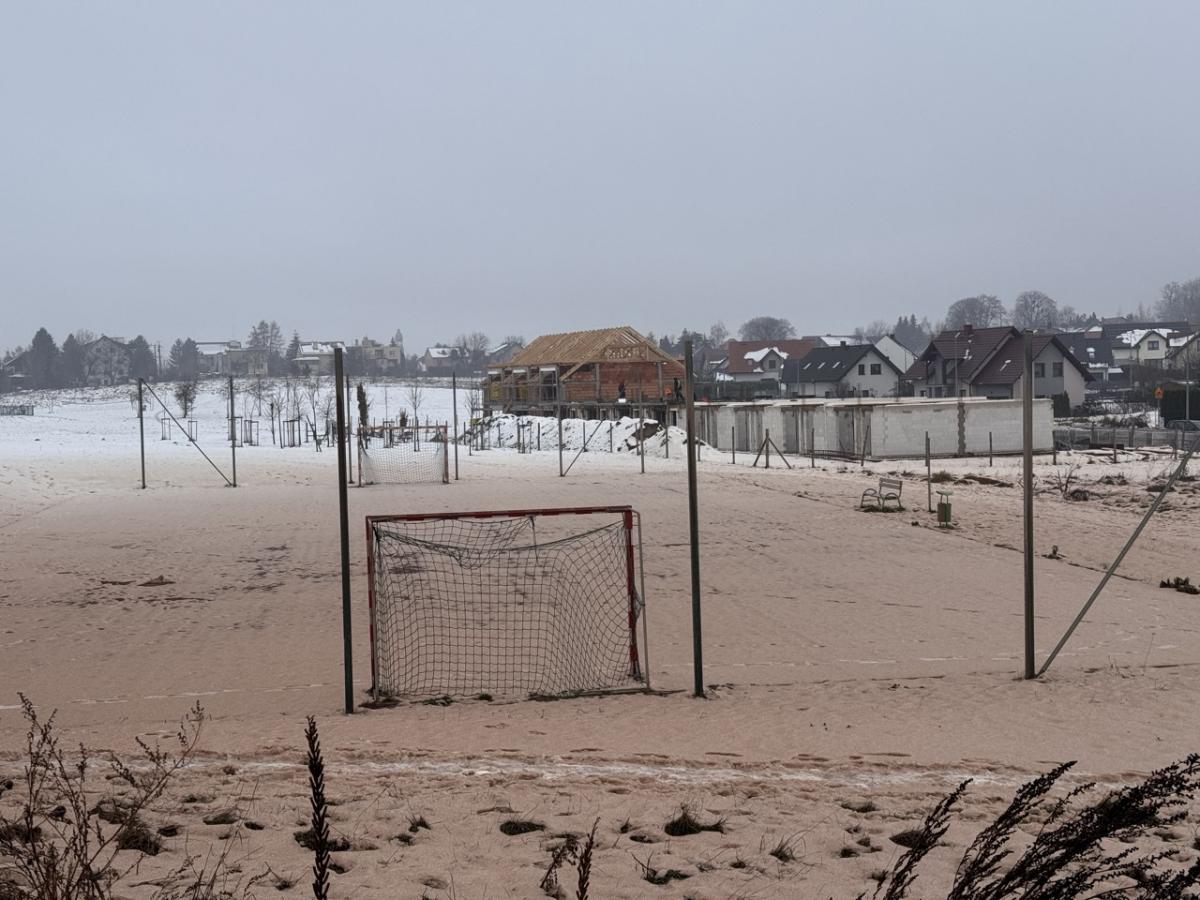 Tak wygląda pobliskie boisko. Na śniegu czerwona substancja